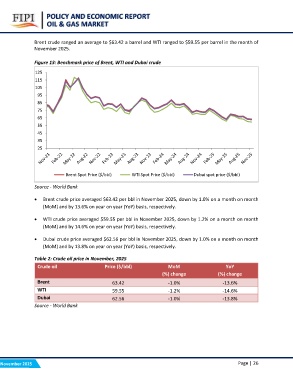 • Brent crude price averaged $63.42 per bbl in November 2025, down by 1.0% on a month on month